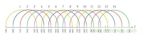 Wi-Fi在802.11b/g的標(biāo)準(zhǔn)的工作頻段為2.4GHz(2.4GHz-2.4888GHz),劃分為14個(gè)信道,每個(gè)信道帶寬為22MHz,Wi-Fi頻譜列表如下所示:
