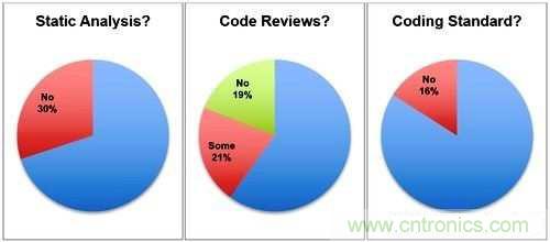 接著讓我們繼續(xù)更深入一點探討:要符合產(chǎn)業(yè)安全性標(biāo)準(zhǔn),可能耗費(fèi)大量成本與時間,那么要實現(xiàn)一個優(yōu)良設(shè)計的其他最佳實作呢?例如在軟體設(shè)計上使用編碼標(biāo)準(zhǔn)、程式碼審查以及統(tǒng)計分析?在這個技術(shù)領(lǐng)域從事攸關(guān)安全裝置設(shè)計的工程師受訪者們的回應(yīng)更令人擔(dān)心了,請看下圖的統(tǒng)計: