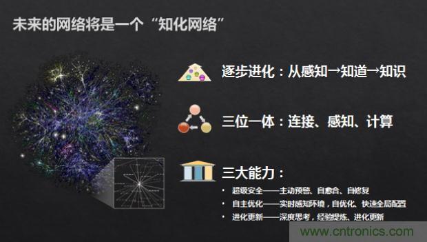 “它”將是一個(gè)“知化”網(wǎng)絡(luò),它將逐步進(jìn)化,從現(xiàn)在這種冰冷的物理連接到主動(dòng)感知各類連接設(shè)備,再到分析了解網(wǎng)絡(luò)運(yùn)行的各種數(shù)據(jù),知曉如何適應(yīng)外界的變化,最后網(wǎng)絡(luò)將有智能思考的能力,形成自身的知識(shí),會(huì)進(jìn)行策略選擇和推演,實(shí)現(xiàn)人、網(wǎng)絡(luò)和應(yīng)用的融合一體。 未來(lái)這個(gè)“知化”的網(wǎng)絡(luò)將是集連接、感知、計(jì)算和數(shù)據(jù)服務(wù)為一體的網(wǎng)絡(luò),將會(huì)實(shí)現(xiàn)超級(jí)安全、自主優(yōu)化、進(jìn)化更新等三大能力。