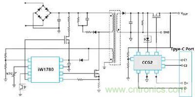 基于PD協(xié)議的充電器電路可以維持AC/DC部分不變,只是將QC協(xié)議控制器替換為PD控制器[1],比如Cypress半導(dǎo)體的CCG2(Type-C Controller Generation 2). CCG2 是最早通過(guò)USB-IF認(rèn)證的PD控制器之一,內(nèi)部包含ARM® Cortex®-M0處理器和完備的PD協(xié)議收發(fā)器,可以滿足充電器,主機(jī),附件,EMAC線纜等各種支持Type-C口的應(yīng)用,在蘋(píng)果,聯(lián)想,HP,Dell,小米,樂(lè)視等一線品牌客戶(hù)都有眾多的量產(chǎn)案例。