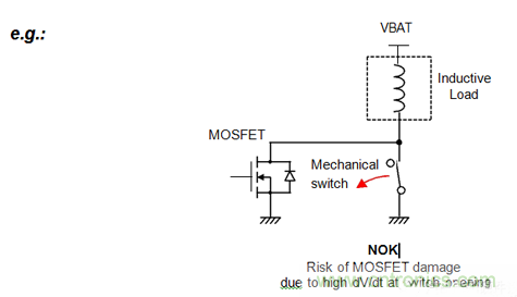當MOSFET處于關(guān)閉狀態(tài)時,開關(guān)的開啟會導致MOSFET的破壞:由于機械開關(guān)的短暫時間,高的dvdt會激活在MOSFET中包含的寄生晶體管。浪涌的能量將集中在這種寄生晶體管上;這可以破壞寄生雙極晶體管,并破壞MOSFET本身。MOSFET在漏極源和源極之間的絕對短路損壞。