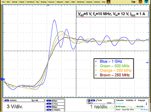 從[1]可清楚看出,可用的最高系統(tǒng)帶寬低于基于EPC8009的設(shè)計的振鈴頻率?,F(xiàn)在我們將觀察選擇不同的系統(tǒng)帶寬如何影響采用更高速的GaN晶體管(如EPC8009)和相對較慢的GaN晶體管(如EPC2045和EPC2022)的開關(guān)節(jié)點波形。