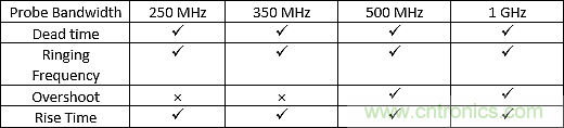 采用EPC8009的設(shè)計所測量到的振鈴頻率(fr1)為1.176GHz,它采用最高帶寬1GHz的探頭。圖2(頂部)中顯示的較低帶寬情況進一步降低了測量振鈴頻率的準確性。當考慮峰值電壓過沖時,同樣很明顯的是,較低帶寬測量值會低估各個開關(guān)器件的峰值電壓。對于與時序相關(guān)的死區(qū)時間的測量,系統(tǒng)帶寬也很重要。如圖2(頂部)所示,對于500MHz和1GHz帶寬,死區(qū)時間是可見的,雖然測量來并不是很精確。在較低帶寬下,死區(qū)時間幾乎不存在。表1顯示了采用最高速的EPC8009,系統(tǒng)帶寬對關(guān)鍵測量結(jié)果的影響。