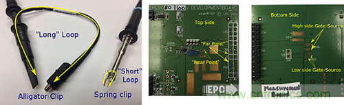 本節(jié)測量技術(shù)使用EPC9080半橋演示板。開關(guān)節(jié)點波形在圖3所示的兩點測量:靠近FET開關(guān)節(jié)點的“近點”;以及PCB外圍引腳端子處的“遠點” 。圖4顯示了每個探測點和配以探頭技術(shù)所測量的開關(guān)節(jié)點(VSW)的波形。