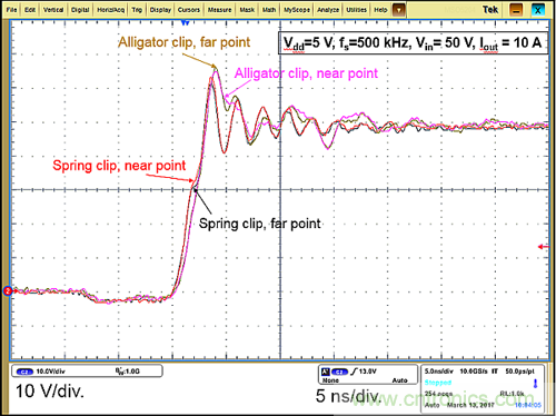 圖4的測得波形清楚地表明,探頭技術(shù)比測量點的選擇重要。雖然有邊緣衰減,紅色和黑色波形幾乎相同。無論測量點的選擇如何,使用鱷魚夾時的波形形狀都非常不準確。我們建議,彈簧夾技術(shù)應(yīng)與最靠近功率器件的測量點(“近點”)結(jié)合使用。