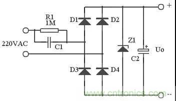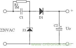在實(shí)際應(yīng)用中,可以用下圖代替上圖,這里用了Z1正向特性和反向特性,其反向特性(也就是其穩(wěn)壓特性)來(lái)穩(wěn)定電壓,其正向特性用來(lái)在市電負(fù)半周給C1提供放電回路。