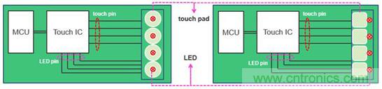 從LED驅(qū)動的角度,比較二者的異同。通常,觸控 IC內(nèi)置了LED Driver。如果應(yīng)用方案中需要使用LED表示觸控動作的有/無,并且應(yīng)用產(chǎn)品的結(jié)構(gòu)設(shè)計(jì),要求LED緊鄰觸控電極,如圖5所示,那么使用觸控 IC更方便PCB的Layout。