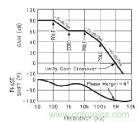 假設(shè)直流增益為80dB(10-100Hz處的增益),100到1KHz增益減少了20dB,10K-100KHz增益減少20dB,100K-1MHz增益減少40dB(斜率有-20dB/10倍頻的變化)。圖中可以看出有3個(gè)POLE,一個(gè)ZERO。1MHz處的增益是0dB,說明1MHz的小信號(hào)在此截止,此回路的帶寬就是1MHz。