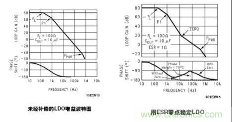 一般的LDO會(huì)由負(fù)載阻抗、輸出容抗等自身產(chǎn)生一些極點(diǎn)。圖中有3個(gè)極點(diǎn)(具體由來就不做分析,可由網(wǎng)絡(luò)分析儀掃描出),但有1個(gè)Ppwr在0dB之后的頻段,也就是帶寬之外,可以不考慮。從上面兩幅波特圖的對(duì)比看出,第二張圖增益曲線,當(dāng)增加了輸出電容后,從80dB到0dB變得更平緩些。系統(tǒng)的帶寬大概從40KHz增加到100KHz左右。相位裕度也相應(yīng)的增加(此例就不仔細(xì)計(jì)算了)。