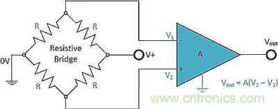 惠斯通電橋(或單臂電橋)電路應(yīng)用非常廣泛,如今在現(xiàn)代運(yùn)算放大器中,我們可以將惠斯通電橋電路與各種傳感器連接。不同于將一個(gè)未知阻值與已知阻值相比,惠斯通電橋在電路中有很多用法?;菟雇姌螂娐肪褪窃陔娫炊撕徒拥亻g兩個(gè)簡(jiǎn)單的電阻串并聯(lián),當(dāng)電橋達(dá)到平衡時(shí)兩個(gè)并聯(lián)分路間產(chǎn)生零壓差。