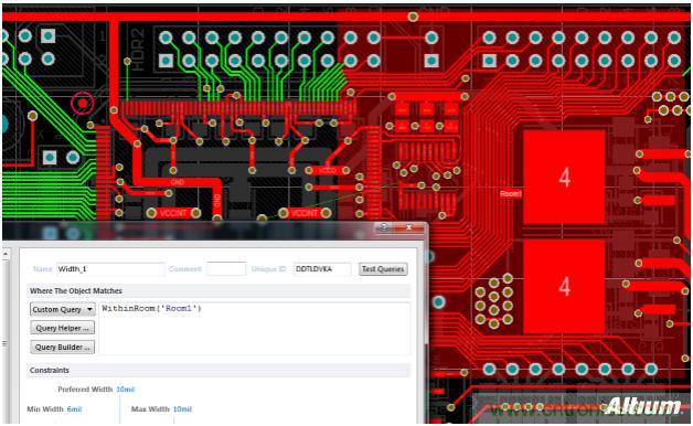 在Room里框選出一定區(qū)域后,不僅僅是可以單獨(dú)設(shè)置線寬規(guī)則,還可以對它設(shè)置PCB Rule規(guī)則定義頁面上的任意規(guī)則。