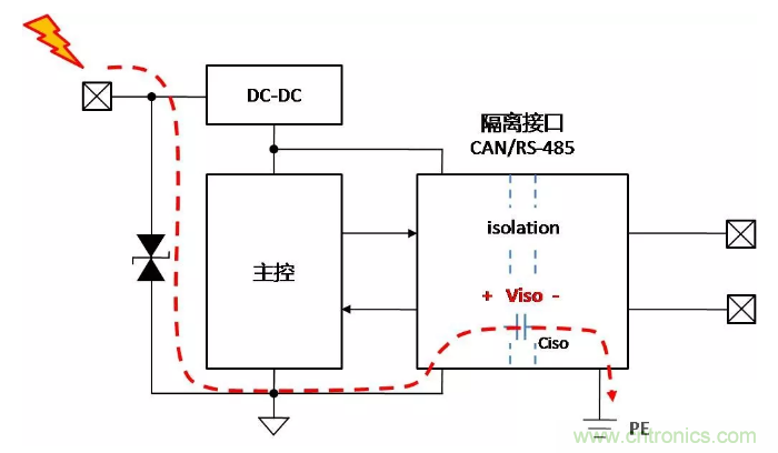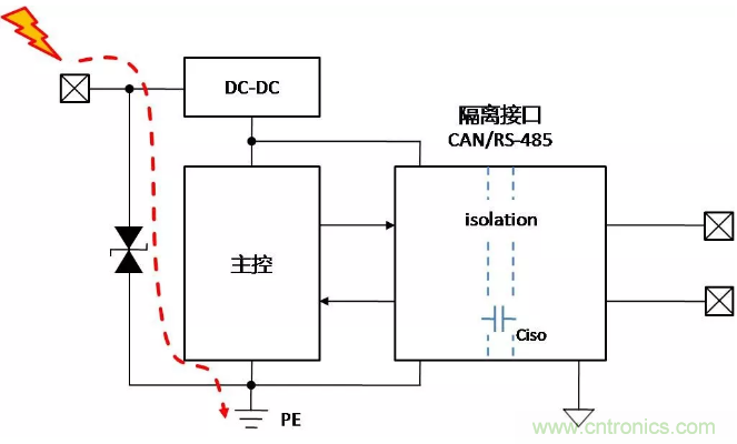 假設(shè)控制側(cè)均做了足夠的保護(hù)措施,當(dāng)控制側(cè)接口受到靜電放電時,能量通過控制側(cè)保護(hù)器泄放至PE,對隔離通信接口基本無影響,如下面圖2。