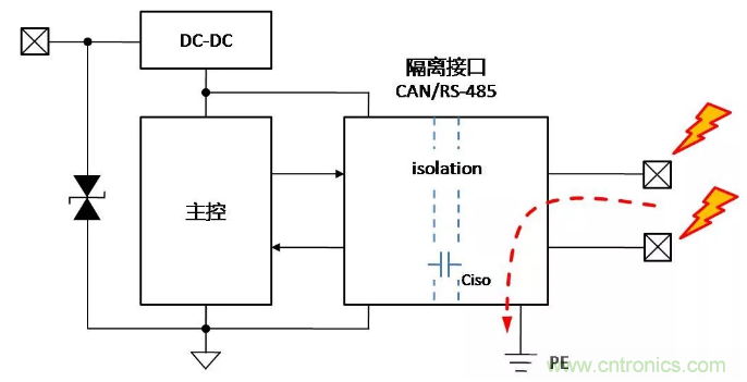 總線增加隔離固然可以保證總線穩(wěn)定可靠地通信,但是帶隔離通信接口的設(shè)備,在復(fù)雜的環(huán)境或安裝狀態(tài)下,接口會表現(xiàn)出完全不同的ESD特性,了解ESD對接口的影響機(jī)理,才能有針對性地增加保護(hù)器件,提升隔離接口的ESD能力。下面以帶有隔離CAN或RS-485通信接口為例,對常見的設(shè)備狀態(tài)下,ESD的作用機(jī)理進(jìn)行分析,并提出相應(yīng)的改善措施。