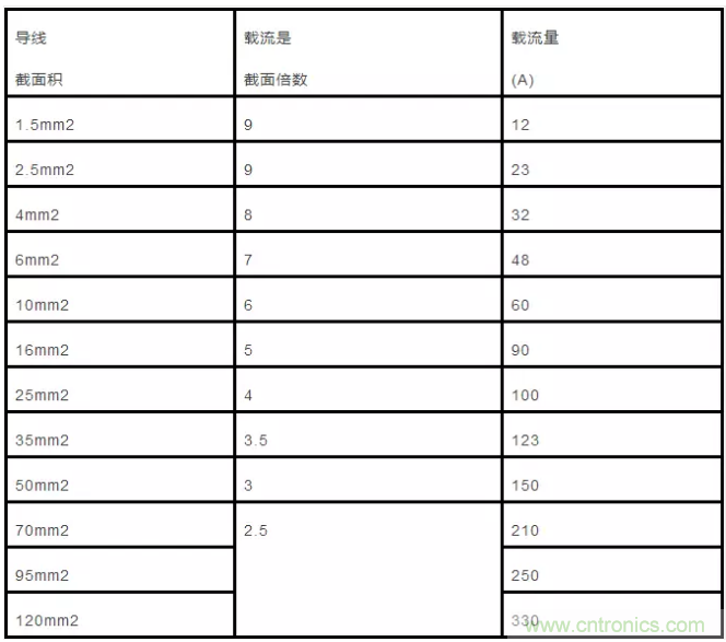 35mm”的導(dǎo)線載流量為截面數(shù)的3.5倍,即35×3.5=122.5(A)。從50mm’及以上的導(dǎo)線,其載流量與截面數(shù)之間的倍數(shù)關(guān)系變?yōu)閮蓚€(gè)兩個(gè)線號(hào)成一組,倍數(shù)依次減0.5。即50、70mm’導(dǎo)線的載流量為截面數(shù)的3倍;95、120mm”導(dǎo)線載流量是其截面積數(shù)的2.5倍,依次類推。