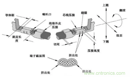 Crimp 是冷壓技術(shù),起源最早可追溯到 1940 年前后。其原理是借助壓線鉗或壓線工具,完成金屬導(dǎo)線和插針的壓接。這種壓接氣密性好、抗腐蝕、線材變形必須超過它的屈服點(diǎn),因此能夠?qū)崿F(xiàn)可靠的數(shù)據(jù)、信號(hào)和動(dòng)力傳輸。在壓接過程中,線的氧化層或硫化層都可以被去除,以壓針和線的殘余彈性保證持久的電氣連接。