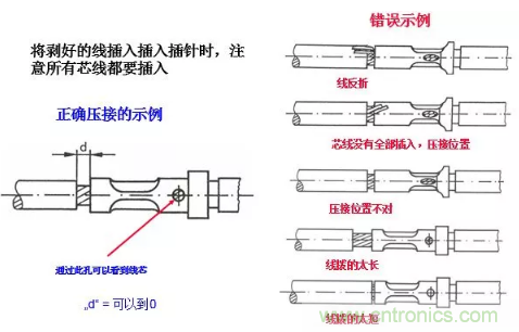 插入時(shí)要留意長(zhǎng)短深度。線纜插入過短容易導(dǎo)致端接達(dá)不到規(guī)定的拉拔力,因?yàn)榫€纜與端子之間的金屬間接觸減少了;而線纜插入過深則會(huì)縮短連接器的使用壽命。以車針壓接為例,當(dāng)?shù)谝粋€(gè)窗口可以觀察到金屬線芯,第二個(gè)窗口可以觀察到線纜外皮時(shí),表示線芯的位置是剛好的。