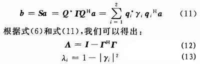 則Q矩陣的第i列qi就稱(chēng)為天線陣列的正交模式。|ai|2表示第i個(gè)端口的入射功率;|mi|2表示第i個(gè)正交模式的激發(fā)功率。由于Q的幺正性,有|a|2=|m|2,這就保證了入射總功率等于激發(fā)起的正交??偣β省6?lambda;i則反應(yīng)了正交模式的輻射效率。