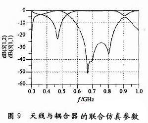 本文從s參數(shù)的角度分析了一個(gè)雙天線系統(tǒng)的去耦合方法,并通過(guò)一個(gè)天線設(shè)計(jì)實(shí)例,使用HFSS和ADS進(jìn)行去耦合前和去耦合后的仿真。結(jié)果顯示加入去耦合網(wǎng)絡(luò)和匹配網(wǎng)絡(luò)后兩個(gè)天線間的耦合可以降低至-35 dB以下,反射系數(shù)也可達(dá)到-15 dB以下,這滿(mǎn)足了工作于710 MHz的移動(dòng)設(shè)備的要求。