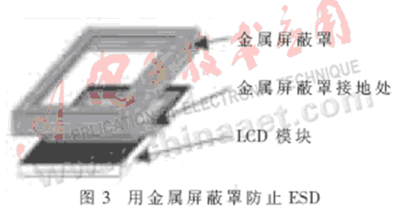 其二,用“疏”的方法。可以用EMI油漆噴涂在殼體的內(nèi)側(cè)。EMI油漆是導(dǎo)電的,可以看成是一個金屬的屏蔽層,這樣可以將靜電導(dǎo)在殼體上;再將殼體與PCB(Printed Circuit Board)的地連接,將靜電從地導(dǎo)走。這樣處理的方法除了可以防止靜電,還能有效抑制EMI的干擾。如果有足夠的空間,還可以用一個金屬屏蔽罩將其中的電路保護(hù)起來,金屬屏蔽罩再連接PCB的GND。圖3是用金屬屏蔽罩將LCD模塊保護(hù)起來的例子。