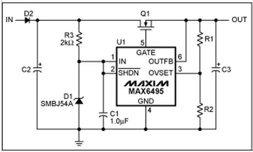 過(guò)壓保護(hù)(OVP)器件數(shù)據(jù)資料中提供的典型電路可以滿足大多數(shù)應(yīng)用的需求(圖1)。然而,有些應(yīng)用需要對(duì)基本電路進(jìn)行適當(dāng)修改。本文討論了兩種類似應(yīng)用:增大電路的最大輸入電壓,在過(guò)壓情況發(fā)生時(shí)利用輸出電容存儲(chǔ)能量。