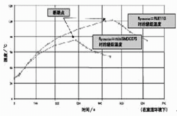 圖4所示是PPTC保護(hù)器件的溫度保護(hù)特性的一個(gè)實(shí)例。