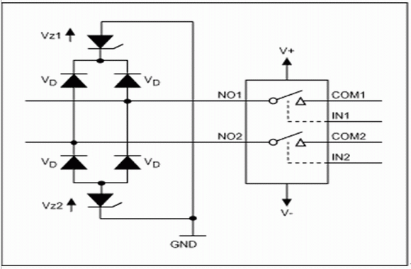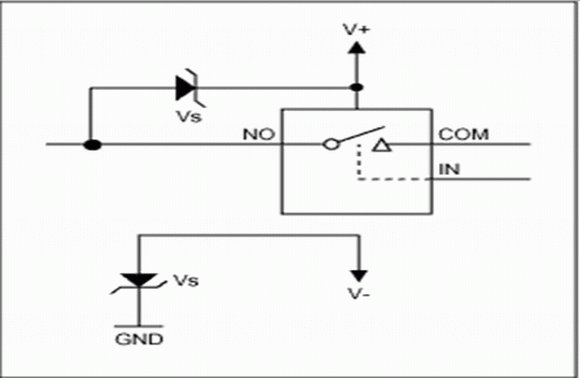 在現(xiàn)有設(shè)計中,大多數(shù)系統(tǒng)工作于標準電源電壓(單極性3.3V或5V,或雙極性±3.3V或±5V),這個電壓通常也是板上的最高電壓。在實際使用中,電路板的輸入端子可能會暴露于比電源電壓更高的電壓之下,同時,電路板電源被切斷后,輸入端子上的電壓有可能仍然存在。受這種過壓影響的第一個元件常常是多路復(fù)用器或開關(guān),這就要求為開關(guān)元件和下游電路提供適當?shù)谋Wo。