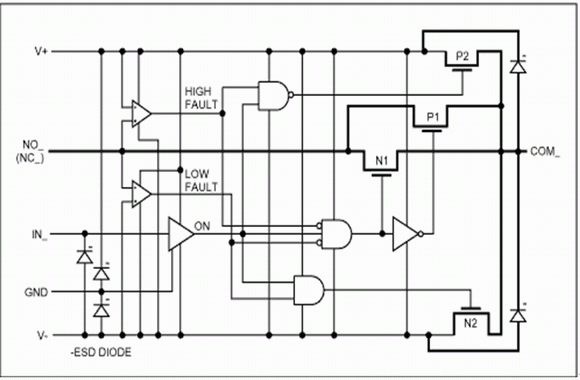 開關(guān)內(nèi)部的兩個比較器用于監(jiān)視輸入電壓,它們將輸入電壓與電源電壓V+和V-進行比較。當NO (常開)端或NC (常閉)端上的信號位于V+和V-之間時,開關(guān)正常工作。當信號電壓超出電源約150mV時(故障情況),輸出電壓(COM)被限制在電源電壓—保持相同極性且輸入為高阻。這是在故障比較器的控制下實現(xiàn)的,它在故障情況下關(guān)閉了N1和P1。故障比較器同時還按照以下規(guī)則控制鉗位FET (N2和P2):如果開關(guān)閉合時出現(xiàn)了負極性故障,接通N2連接COM到V-。如果開關(guān)閉合時出現(xiàn)了正極性故障,則接通P2連接COM到V+。如果開關(guān)開路時出現(xiàn)了故障,則輸出呈現(xiàn)高阻。