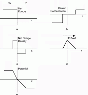 二極管的特性可以通過如圖1所示的突變型PN結(jié)來做深入理解??紤]到兩片硅材料,一片是重?fù)搅耸┲麟s質(zhì)的n+硅,一片是輕摻了受主雜質(zhì)的p硅。如圖1a所示那樣我們?cè)趚=0處將它們結(jié)合。n+區(qū)域電子密度等于施主雜質(zhì)的數(shù)目,而P區(qū)域認(rèn)為空穴密度等于受主雜質(zhì)濃度,但這種靜態(tài)情況將不會(huì)持續(xù)。在PN結(jié)邊界處電子將和空穴重新結(jié)合,結(jié)果是導(dǎo)致在PN結(jié)連接處的區(qū)域電子和空隙全被耗空。這就是圖1b所示的耗盡層,或者說是零載流子濃度區(qū)域。在這個(gè)連接處區(qū)域隨著載流子濃度的耗盡就成為靜電荷區(qū)域,如圖1c。在橫坐標(biāo)零點(diǎn)左邊,由于電子和右邊的空穴中和從而只剩下帶正電的靜電荷;在零點(diǎn)右邊,由于空穴和左邊的電子中和從而只剩下帶負(fù)電的靜電荷。在PN結(jié)連接處的兩邊耗盡區(qū)的寬度依賴于兩邊施主雜質(zhì)和受主雜質(zhì)各自的摻雜濃度。有個(gè)物理現(xiàn)象是PN結(jié)耗盡區(qū)總的正電荷數(shù)和負(fù)電荷數(shù)一樣,所以PN總體還是呈現(xiàn)不帶電狀態(tài)。 PN結(jié)連接處摻雜濃度高的一邊的耗盡層寬度比摻雜濃度低的一邊要窄得多。 耗盡區(qū)一定的靜電荷密度的存在產(chǎn)生了一個(gè)電場(chǎng),其場(chǎng)強(qiáng)最大的地方是PN結(jié)連接處,如圖1d所示。PN結(jié)的電場(chǎng)存在產(chǎn)生了內(nèi)建電壓差,如圖1e所示。電場(chǎng)和電壓的存在會(huì)迫使電子向n區(qū)域移動(dòng),而空穴向p區(qū)移動(dòng)。