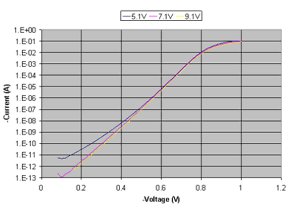 圖4 不同反向擊穿電壓的三個(gè)穩(wěn)壓二極管正向偏壓下的電流相對(duì)電壓的曲線
