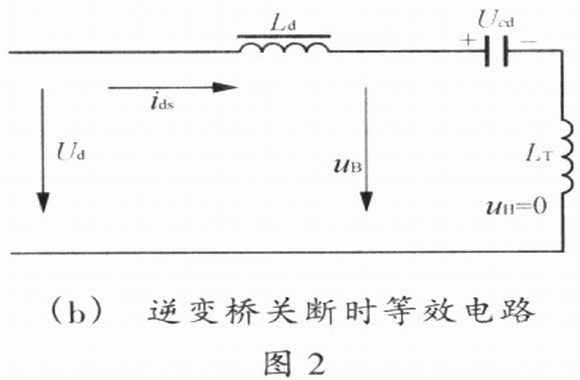 這一浪涌電流由檢測(cè)電路檢巾并使保護(hù)電路立即動(dòng)作,發(fā)出過(guò)流信號(hào),整流電路即由整流狀態(tài)向逆變電路過(guò)渡。逆變橋關(guān)斷時(shí)的等效電路如圖2(b)所示,短路電流ids移至Cd支路,Cd被充電,Cd端壓逐漸上升,短路電流下降,此后短路電流在Cd、Ld、以及吸收電路中R和C構(gòu)成的回路中作振蕩衰減,直至能量消耗完為止。ids沿Ld流過(guò),由于電路的慣性較大,電流增長(zhǎng)不多,近似于短路前的工作電流Ido,于是浪涌電路的幅值為Ism=IHsm+Ido (4)