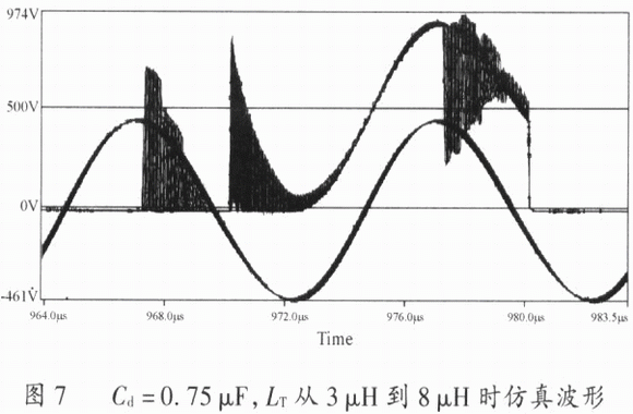 圖6是LT/Cd=4,Cd=0.75μF,LT=3μH時(shí)的仿真波形,通過(guò)與圖4和圖5的對(duì)比可以看出,此時(shí)參數(shù)選擇最為合適。