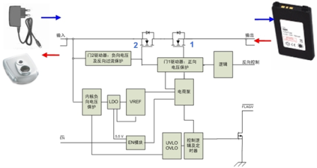 安森美半導(dǎo)體的NCP370是實(shí)現(xiàn)上述保護(hù)方案設(shè)想的業(yè)界首款集成型雙向保護(hù)器件,其功能模塊圖如圖2所示。其中,在針對(duì)直接充電通道的保護(hù)方面,新的NCP370提供高達(dá)+28 V的正向過壓保護(hù)和低至-28 V的負(fù)向過壓保護(hù),顯著改善便攜設(shè)備的前端保護(hù)能力。同時(shí)NCP370還內(nèi)置過壓鎖定(OVLO)電路,在過壓條件下,只要輸入電壓超過OVLO閾值,輸出就會(huì)被關(guān)閉。NCP370集成了兩顆典型值為130 mΩ的低導(dǎo)通阻抗(Ron)的N溝道MOSFET(即NMOS),支持高達(dá)1.3 A的大充電電流。而從圖2中可以看出,NCP370采用了兩個(gè)背靠背(back-to-back)的NMOS。控制第1個(gè)NMOS的門極,可以消除直接充電通道的浪涌電流和正向過壓。