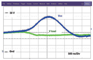 圖2展示NIS5132的一對曲線。導(dǎo)通較低的曲線時,激活的是短路曲線。一旦電流降低至低于這個電平,F(xiàn)ET就完全導(dǎo)通(線性區(qū)域),接下來面對的就是過載電平。如果電流達(dá)到過載電平,F(xiàn)ET的柵驅(qū)動將立即減小,而漏極至源極電壓將增加,并會將工作模式改為短路電平模式。這器件在過載電平時不能維持穩(wěn)態(tài)工作。