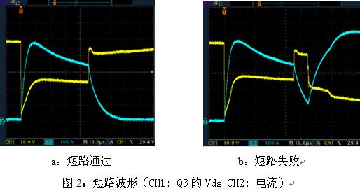 當(dāng)控制器工作時,如電機(jī)短路,則會形成如圖1中所示的流經(jīng)Q2,Q3的短路電流,其電流值很大,達(dá)幾百安培,MOSFET的瞬態(tài)溫升很大,這種情況下應(yīng)及時保護(hù),否則會使MOSFET結(jié)點(diǎn)溫度過高而使MOSFET損壞。短路時Q3電壓和電流波形如圖2所示。圖2a中的MOSFET能承受45us的大電流短路,而圖2b中的MOSFET不能承受45us的大電流短路,當(dāng)脈沖45us關(guān)斷后,Vds回升,由于溫度過高,僅經(jīng)過10us的時間MOSFET便短路,Vds迅速下降,短路電流迅速上升。由圖2我們可以看出短路時峰值電流達(dá)500A,這是由于短路時MOSFET直接將電源正負(fù)極短路,回路阻抗是導(dǎo)線,PCB走線及MOSFET的Rds(on)之和,其數(shù)值很小,一般為幾十毫歐至幾百毫歐。