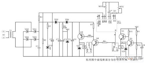 該電路核心部分由IC4541構(gòu)成,延時設(shè)定由RP2、C*設(shè)定,A-B端根據(jù)需求接相應高、低電平(設(shè)定端)內(nèi)部2繞組閉鎖繼電器采用DC12V(因繼電器工作電壓與IC4060組成延時電器要低,則為保證其驅(qū)動則分別由V6、V7、V1、V3構(gòu)成)。其中C2為二次儲能器件,可根據(jù)延時的長短予以調(diào)整,C4為完成S置位線圈工作。