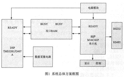 硬件平臺是軟件算法的運(yùn)行載體,是實(shí)現(xiàn)準(zhǔn)確、高效選線的保障。本文設(shè)計的選線裝置采用雙CPU。即"DSP+單片機(jī)"的處理機(jī)構(gòu)。DSP作為運(yùn)算CPU,負(fù)責(zé)信號采集、選線計算部分;單片機(jī)作為管理CPU,主要負(fù)責(zé)人機(jī)交互部分。DSP處理器由于內(nèi)部采用哈佛總線結(jié)構(gòu),指令是流水線操作,以及獨(dú)立的硬件乘法器結(jié)構(gòu)等,非常適合進(jìn)行數(shù)字信號處理,進(jìn)行實(shí)時的數(shù)據(jù)分析和監(jiān)控。本文采用TI公司的TMS320LF2407A(以下簡稱LF2407A)DSP芯片為數(shù)據(jù)采集和處理CPU,充分利用其強(qiáng)大的數(shù)據(jù)處理能力和速度,實(shí)現(xiàn)多點(diǎn)數(shù)據(jù)采集和快速參數(shù)計算。單片機(jī)采用瑞薩M16C/62P系列單片機(jī),該單片機(jī)具有很強(qiáng)的抗干擾能力和1M的尋址空間,適用于事件管理和人機(jī)交互。系統(tǒng)總體方案如圖1所示。本保護(hù)裝置位于現(xiàn)場,進(jìn)行數(shù)據(jù)采集和處理,并且與上位機(jī)之間進(jìn)行通信。保護(hù)裝置采用M16C/62P單片機(jī)為主CPU,負(fù)責(zé)系統(tǒng)顯示、控制和與上位機(jī)通信;采用TMS320LF2407ADSP為從CPU,負(fù)責(zé)數(shù)據(jù)采集和處理;DSP與單片機(jī)之間用雙端口RAM進(jìn)行通信。系統(tǒng)通過RS232和RS485與上位機(jī)通信。