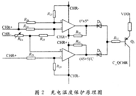 為了確保充電時的安全性和延長電池的使用壽命,電池的充電溫度應控制在O~45℃之間為宜。該系統(tǒng)采用一個負溫度系數(shù)的NTC溫度傳感器RES和一個2路比較器LM393來實現(xiàn)充電溫度保護,其原理圖如圖2所示:當充電溫度位于O~45℃之間時,LM393的兩路比較器輸出均為高阻態(tài),PNP型三極管Q1關斷,對充電電路不產(chǎn)生影響;隨著溫度的升高,RES阻值逐漸變小,當溫度大于45℃時,LM393下面一路比較器反轉(zhuǎn),輸出低電平,通過二極管D6將Q1的B極拉低,Q1導通,充電MOS管QCHRl的G極C_QCHR被強制拉高,QCHRl關閉,停止充電;同樣,隨著溫度的降低,RES阻值逐漸變大,當溫度小于O℃時,LM393上面一路比較器輸出低電平,通過二極管D5將Q1導通,從而關閉QCHRl,停止充電。[page]