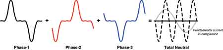 所有中性導線都并入配電板中的一個大直徑中性導線,就像一個變壓器一樣(見圖5)。在線性負載情況下,多相位系統(tǒng)的中性電流在一定程度上相互抵消。由于負載不平衡(見圖3),只有總中性電流的一小部分保留了下來。