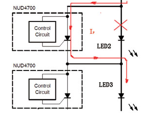 NUD4700的典型應(yīng)用電路如圖4所示。這是一個交流供電,往AC/DC轉(zhuǎn)換器輸出直流電壓,再由NUD4701恒流LED驅(qū)動器驅(qū)動5個串聯(lián)的1W大功率LED的電路。NUD4700與LED并聯(lián)連接在一起。在LED未開路時,由于LED的正向降壓VF小于晶閘管的“開啟”電壓V(BR),則NUD4700為“關(guān)閉狀態(tài)”。在關(guān)閉狀態(tài)時,只有小于250μA的漏電電流經(jīng)過NUD4700,相當于NUD4700“開路”,不影響LED的工作。若串聯(lián)的LED中有一個(如LED2)因損壞而開路了,此時與LED2并聯(lián)的NUD4700的A、C之間電壓超過了“啟動”電壓V(BR)(5.5~7.5V),NUD4700啟動,由關(guān)閉狀態(tài)轉(zhuǎn)為“導(dǎo)通狀態(tài)”。在導(dǎo)通狀態(tài)時,A、C之間導(dǎo)通電壓VT為1.0~1.2V。此時,LED的電流由LED1流經(jīng)NUD4700的A、C,再流入LED3,如圖5所示。5個LED的燈僅有4個LED工作,其亮度稍差一些,但仍可以正常工作,并且不影響其恒流的大小。