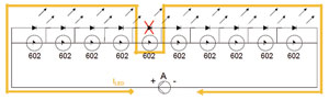 若在串聯(lián)的LED中有一個開路,如圖9所示,則與此并聯(lián)的SMD602的正、負極之間電壓大于其開啟電壓4.65~5.25V,此器件由關(guān)閉狀態(tài)轉(zhuǎn)換為導(dǎo)通狀態(tài),降壓為1~1.2V。LED電流經(jīng)SMD602內(nèi)部的晶閘管后流到下一個LED,保證其他未開路的LED正常工作。圖中用紅線X表示此LED開路。