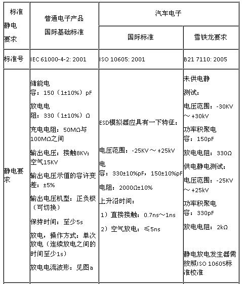 靜電問題對(duì)電子設(shè)備來說是必須考慮和預(yù)防的。為了防止電子設(shè)備在靜電干擾時(shí)出現(xiàn)產(chǎn)生不必要的誤動(dòng)作,因此各個(gè)國(guó)家、各行業(yè)也都對(duì)于相關(guān)的電子設(shè)備做出了靜電測(cè)試(ESD)要求。本文就以普通電子產(chǎn)品的國(guó)際基礎(chǔ)標(biāo)準(zhǔn)要求與汽車電子的國(guó)際標(biāo)準(zhǔn)(以雪鐵龍企業(yè)標(biāo)準(zhǔn)為例)做一比較。