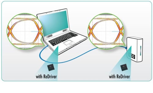 如果放在接收器之前,轉(zhuǎn)接驅(qū)動器可以有效打開信號眼圖的開口,從而將信號質(zhì)量恢復(fù)到可以接收的范圍內(nèi)。轉(zhuǎn)接驅(qū)動器可以調(diào)節(jié)信號、使用信號均衡的功能減少信號衰減和抖動,因此可以在更長的距離和通過多個連接器的情況下提供干凈的信號傳送通道。信號可以恢復(fù)原有的強度再次傳送,就像是將信號通道拆成數(shù)個段落,并且在每個段落恢復(fù)信號的質(zhì)量。轉(zhuǎn)接驅(qū)動器也允許產(chǎn)品設(shè)計師依照特定的應(yīng)用類型調(diào)整最佳的信號均衡效果,因此可以確保設(shè)備可以通過最嚴(yán)格的USB3.0認(rèn)證要求。