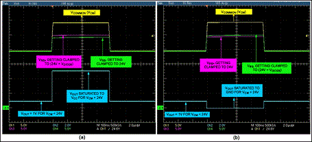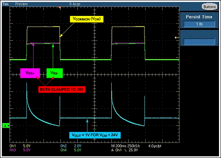 圖2是當(dāng)移走D1時,35V拋負(fù)載脈沖下放大器的輸出。施加電壓為電池標(biāo)稱電壓,所要求的輸出電壓為1V(輸入VSENSE=50mV、增益=20)。出現(xiàn)拋負(fù)載電壓時,齊納管把輸入共模電壓鉗位在大約24V,放大器輸出經(jīng)過幾個短暫的波動后穩(wěn)定到0V。