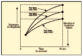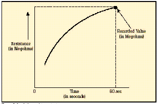 在短時(shí)測(cè)試中,兆歐表被直接跨接在被測(cè)設(shè)備上,施加大約60秒的測(cè)試電壓。為了在大約一分鐘的時(shí)間內(nèi)使絕緣值讀數(shù)達(dá)到穩(wěn)定,應(yīng)該只對(duì)低容性的設(shè)備進(jìn)行該項(xiàng)測(cè)試。基本的連接步驟和驗(yàn)證測(cè)試時(shí)相同,所施加的電壓按DC測(cè)試電壓公式進(jìn)行計(jì)算。當(dāng)測(cè)試好的設(shè)備時(shí),您會(huì)注意到,隨電容容量和吸收電流的降低,絕緣阻抗值會(huì)穩(wěn)定上升。由于溫度和濕度會(huì)影響測(cè)試結(jié)果,應(yīng)該在標(biāo)準(zhǔn)溫度(大約20?C/68?F)下、露點(diǎn)之上的環(huán)境下進(jìn)行測(cè)試。 當(dāng)設(shè)備的額定值等于或小于1000伏特時(shí),絕緣讀數(shù)應(yīng)該為1MΩ或更高。當(dāng)設(shè)備額定值高于1000伏特時(shí),理想的阻抗應(yīng)該為每1000伏特上升1MΩ。所測(cè)量的絕緣阻抗值通常會(huì)略低于以前記錄的值,其下降的趨勢(shì)規(guī)律如圖6所示。絕緣值下降的斜率是絕緣材料老化程度的正常信號(hào)。陡峭的下降斜率是絕緣失效或可能出現(xiàn)故障的先兆。