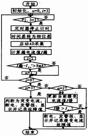 漏電流檢測的流程圖如圖3所示。漏電流信號過零點后,開始AD采樣轉(zhuǎn)換,根據(jù)定時器測得漏電流和工作電壓之間的時間差計算相位差,得到漏電流的大小,將連續(xù)3個周期同一時刻的值分別與突變電流和緩變電流的設定值作比較,判斷當前是否發(fā)生漏電;若漏電,漏電由緩變電流引起還是突變電流引起;若大于整定值則立刻斷電并顯示系統(tǒng)當前故障值并報警等。