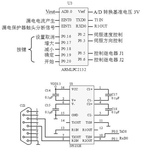 由于A/D轉(zhuǎn)換為10位,當(dāng)輸入電壓為5V時(shí),輸出數(shù)據(jù)值為1024(4FFH),因此最大分辨率為0.0049V(5V/1024)。若產(chǎn)生測(cè)試電流的回路電阻為12Ω時(shí),漏電電流的分辨率為0.4mA(0.0049V/12Ω),完全滿足測(cè)試需要。漏電保護(hù)器的漏電電流產(chǎn)生的開(kāi)始信號(hào)和動(dòng)、靜觸頭斷開(kāi)信號(hào)分別送入LPC2132的外部中斷輸入端,采用中斷的方式對(duì)漏電保護(hù)器動(dòng)、靜觸頭的分?jǐn)鄷r(shí)間進(jìn)行檢測(cè)。P0.5與P0.6腳分別控制繼電器J1、J2的閉合和分?jǐn)啵x擇三種不同測(cè)量范圍的測(cè)試電流。LPC2132與上位機(jī)之間采用串行通信,由于系統(tǒng)是3.3V系統(tǒng),所以要使用SP3232E進(jìn)行RS-232電平轉(zhuǎn)換。SP3232E是3V工作電源的RS-232轉(zhuǎn)換芯片。A/D轉(zhuǎn)換及控制電路如圖4所示。