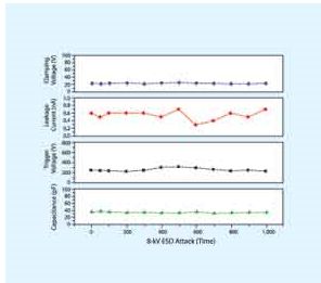 多年以來,在多種電器設備中廣泛應用多層壓敏電阻來提供有效的靜電放電抑制。多層壓敏電阻相對較低的擊穿電壓和觸發(fā)電壓以及能經受多次脈沖的能力是相當令人滿意的??墒?,多層壓敏電阻具有較高的漏電流和電容,并且降低電容帶來的有害影響導致其無法勝任高速數(shù)據(jù)的應用。[page]