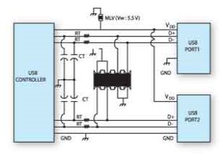 許多高速數(shù)據(jù)應用和終端產品采用混合式保護方式,在數(shù)據(jù)和時鐘線上采用基于間隙的器件,在電源連接部分采用多層壓敏電阻或基于硅的瞬態(tài)電壓抑制二極管。例如,USB接口的D+和D–線要求高速保護,這可以采用分立的芯片利用附加的多層壓敏電阻或瞬態(tài)電壓抑制器件用于VDD電源保護。PC、筆記本電腦、上網本等產品中常常需要多個USB接口連接。