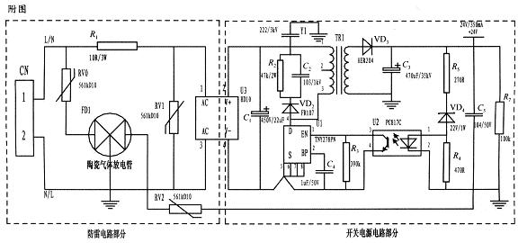 陶瓷氣體放電管的通流容量根據(jù)要求的通流容量選擇,電路采用3RM470L-7.5-L,通流量為5000A。線繞電阻R1起限流分壓作用;貼片整流模塊為開(kāi)關(guān)電源電路前端整流作用,C1為高壓濾波電容,Y1為去耦電容,電阻R2和電容C2及VD2組成開(kāi)關(guān)電源芯片MOS管的吸收鉗位電路,保護(hù)芯片,開(kāi)關(guān)電源芯片采用PI公司的TNY27系列,TR1為高頻變壓器,VD3、C3構(gòu)成高頻變壓器次級(jí)濾波,U2、VD4、R3、R4、R5構(gòu)成開(kāi)關(guān)電源電路的反饋電路,可將變壓器次級(jí)輸出電壓穩(wěn)定在設(shè)計(jì)值,此防雷抗浪涌電路在實(shí)際使用中取得了較好的效果。