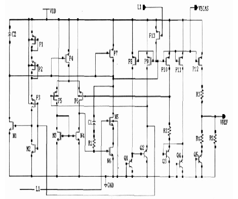 圖1中N1,N2, P1, P2, P3, C1作為啟動(dòng)電路,有源電阻P1, P2 起限流作用。N5, P13 為開關(guān)管,當(dāng)保護(hù)電路處于休眠狀態(tài)時(shí),電路必須停止工作,使功耗降為最低,此時(shí)通過內(nèi)部控制電路使L1 為低電位, P13 管打開,使偏置點(diǎn)VB IAS上升為高電位,P4, P7, P8, P9 , P10, P11, P12管截止,N5管關(guān)閉,切斷由P13,N6形成的支路,該電路停止工作,電流幾乎為零。經(jīng)仿真,該基準(zhǔn)電路在2. 2V電壓下可正常工作。